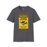 Blue t-shirt with a yellow and black shark warning sign on a white background